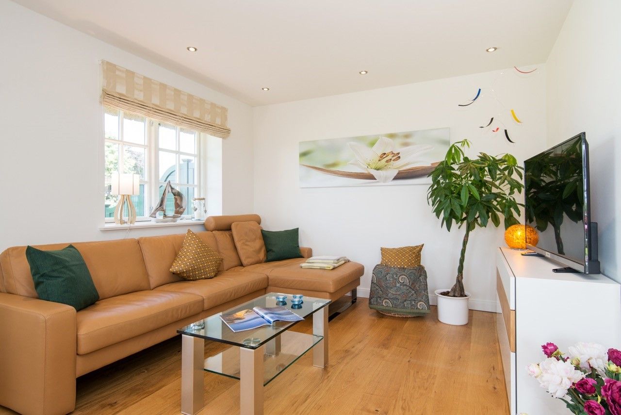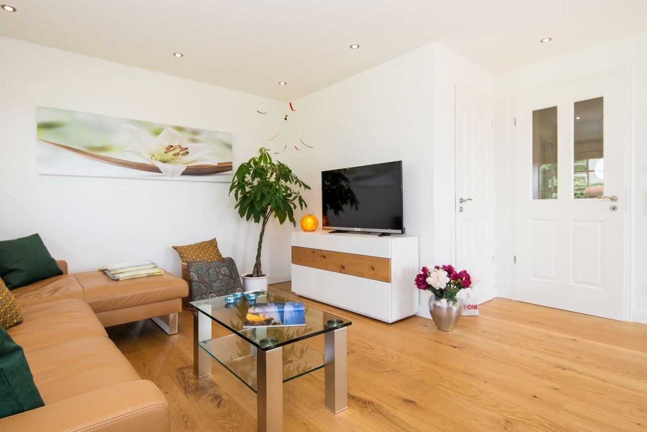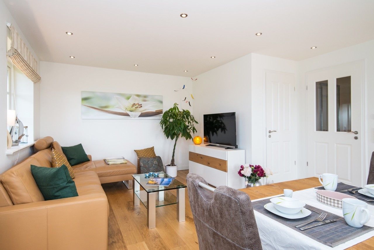 Das helle, licht durchflutete Wohnzimmer verfügt über eine bequeme Sitzecke. Selbstverständlich mit Radio/CD-Player, sowie einen hochwertigen Flachbildfernseher.