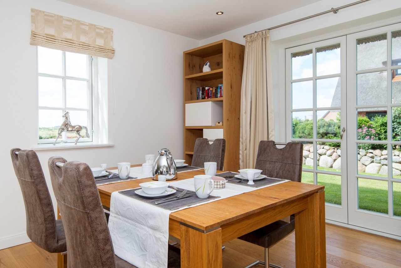 Im EG befinden sich ein großzügiges Wohnzimmer mit Essbereich und angrenzender Küche. Die topaktuelle Küche ist mit allem ausgestattet was Sie benötigen. Backofen, 4er Cerankochfeld, Dunstabzug, Geschirrspüler, Kühlschrank mit Gefrierfach, Kaffeemaschine, Wasserkocher, Toaster, Kochgeschirr und vieles mehr sind für eine bequeme Selbstversorgung vorhanden.