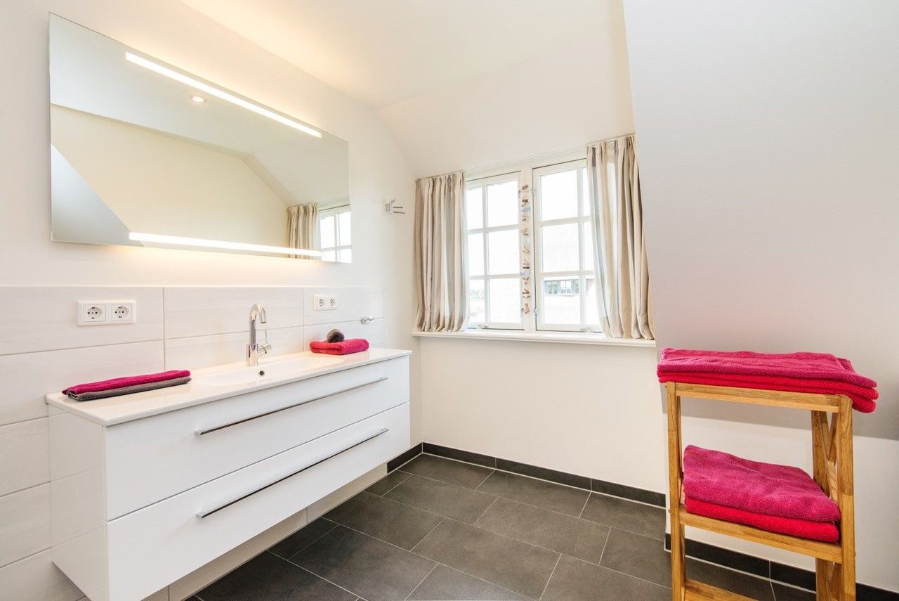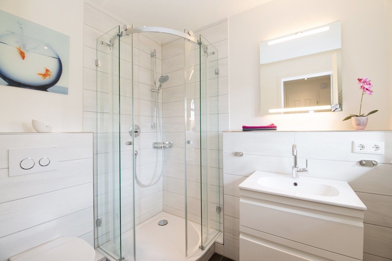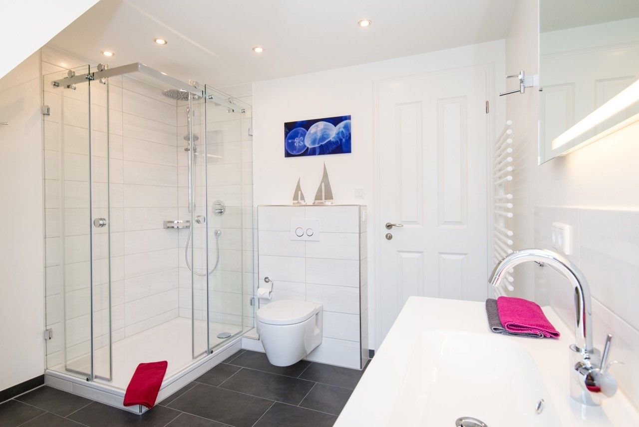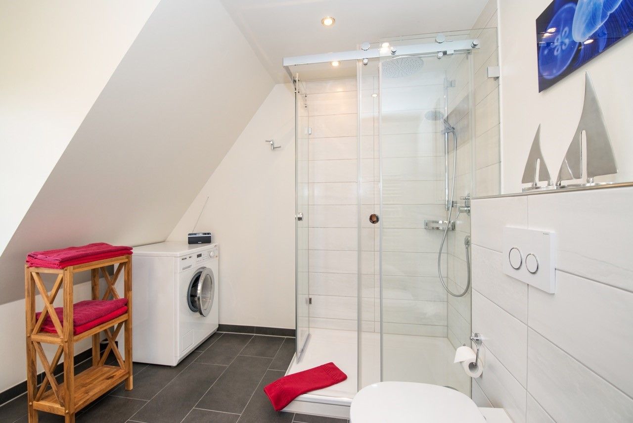 Das Badezimmer im OG ist topmodern und hell eingerichtet. Es verfügt neben WC und Waschtisch über eine großzügige Vollglas-Dusche und einem Handtuchwärmekörper sowie einen Haar-Fön. Dort befindet sich auch der Waschtrockner.